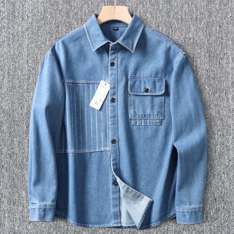 - 新品 DCKMANY デニム シャツ メンズ 長袖 ダンガリー 春夏 薄手 ユーズド加工 切替デザイン コットン ゆったり 胸ポケット/青色T8042-M