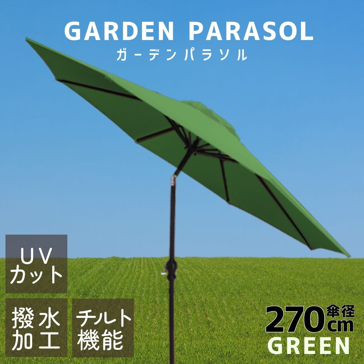 - 【グリーン 270cm】パラソル ガーデン チルト機能 大型 日よけ 撥水 ベンチレーション UVカット 折りたたみ 庭 ビーチパラソル シェード