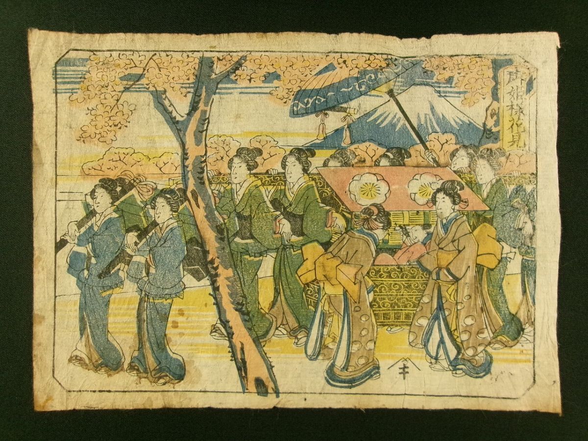 - s345◆御姫様花見◆彩色木版画◆江戸期 富士山 桜@刷物/摺物/錦絵/古文書