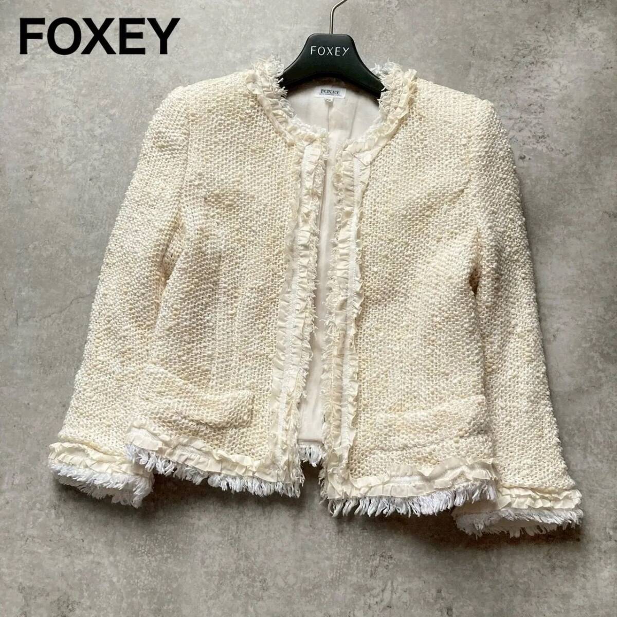 > 美品 FOXEY BOUTIQUE フォクシー 上質 ノーカラージャケット 38サイズ S-M オフホワイト アイボリー 白 ツイード フリンジ フリル 日本製
