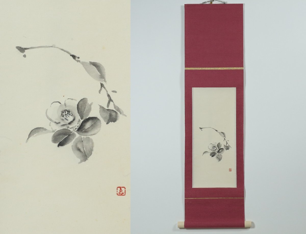・掛軸「白椿」水墨画 紙本 肉筆 /掛け軸 茶掛け 在銘