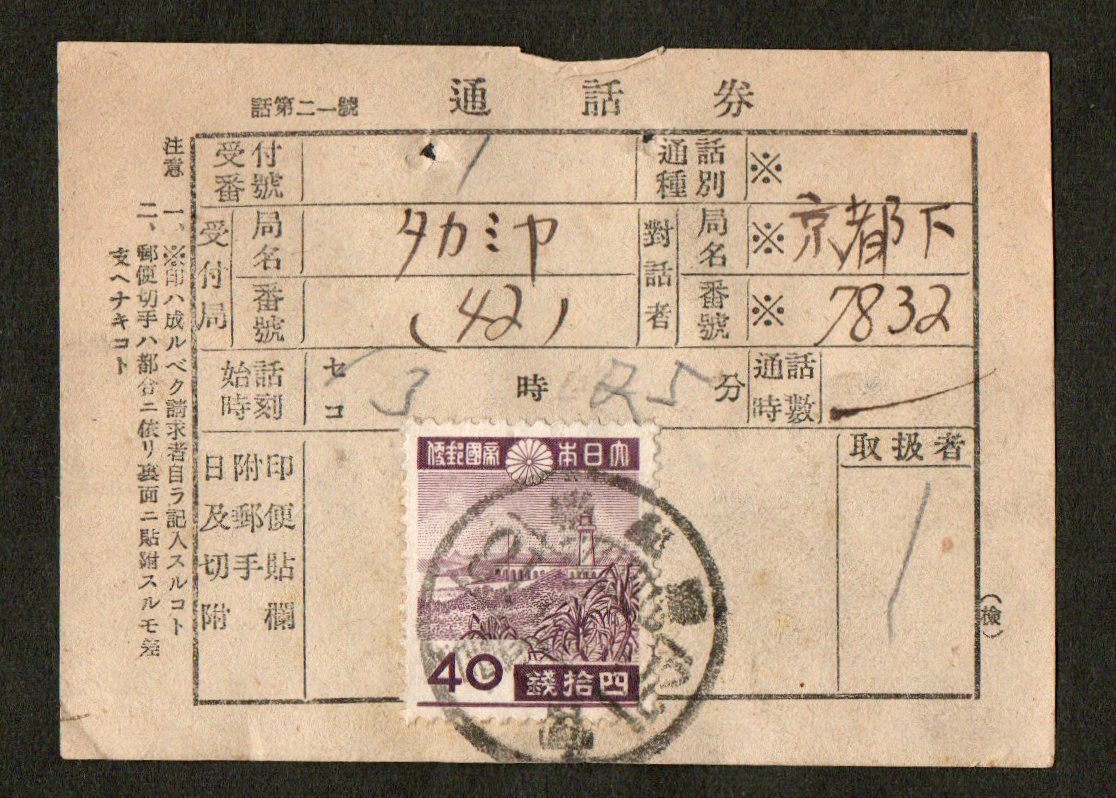 - 終戦直後通話券使用例 2昭40銭貼 高宮 20.12.16 滋賀県