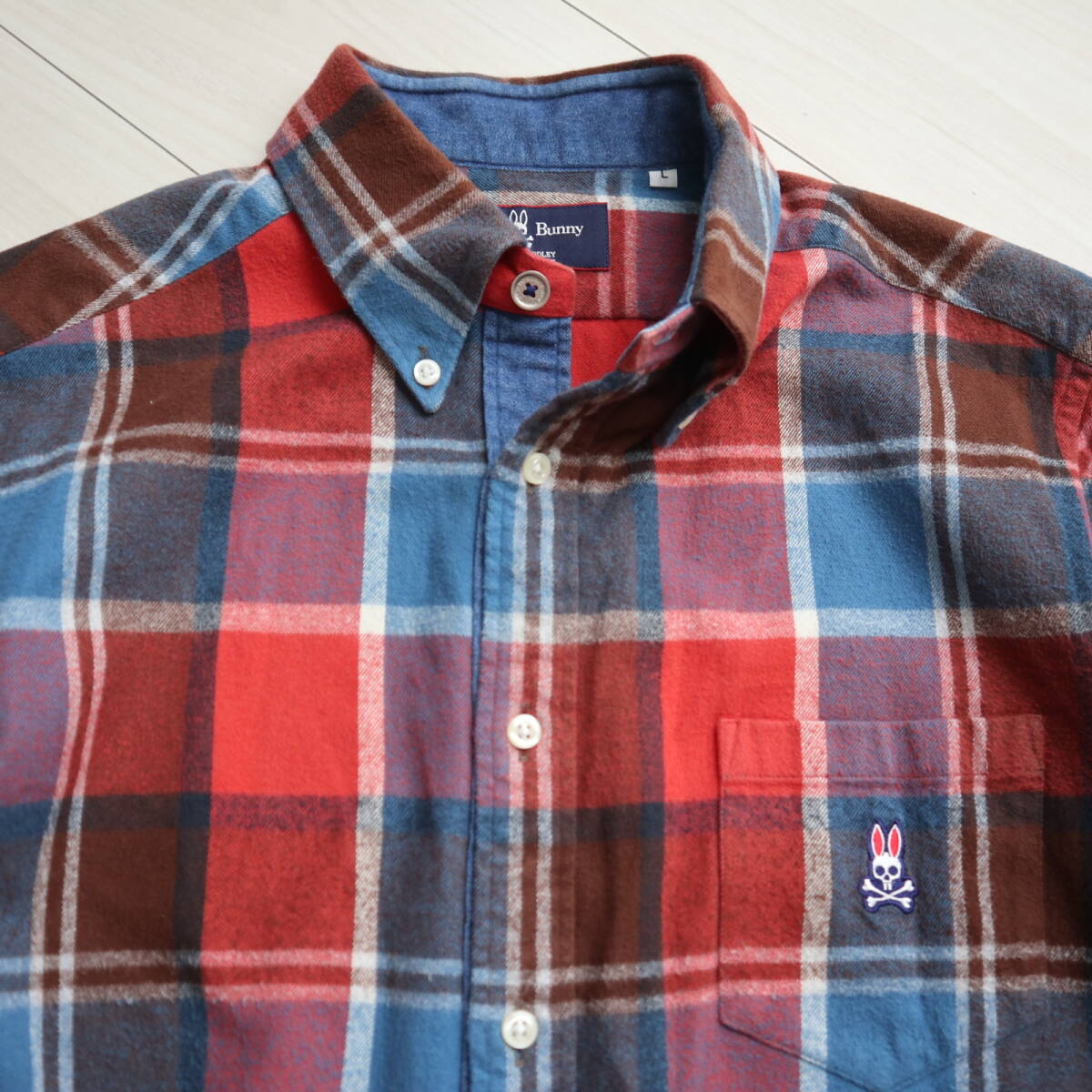- 秋冬!起毛・日本製★Psycho Bunny サイコバニー★スカル バニー 長袖 ボタンダウン チェック ネルシャツ/メンズ/サイズL