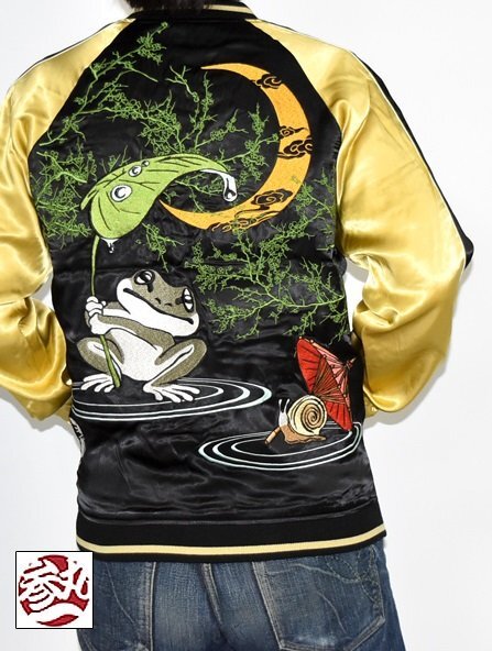- 「雨宿り」総刺繍リバーシブルスカジャン◆参丸一 ブラック×ゴールド XXLサイズ SM-30627 和柄 和風 蛙 カエル かえる スーベニア