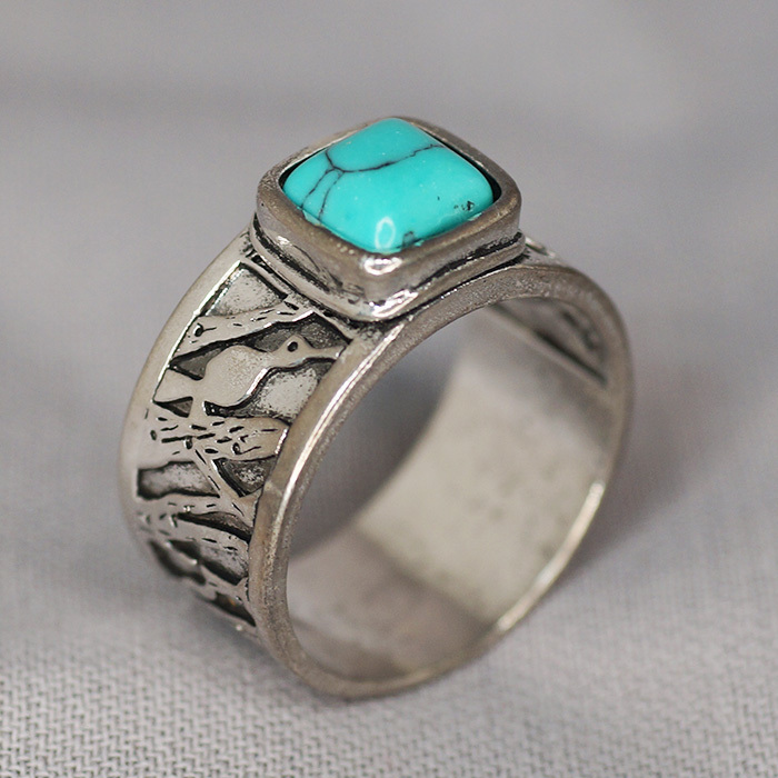 - [RING] Silver Plated ターコイズ ブルー 四角形 ストーン 鳥がとまった枝 デザイン 10mm ワイド シルバー リング 23号