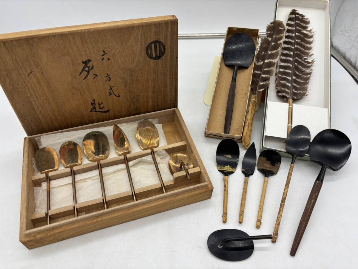 - 【希少】六方式灰匙 羽箒 十五点揃 煎茶道具 風炉 東西南北天地 真鍮製 銅製 茶道具 茶器 陶器 陶芸 骨董 共箱