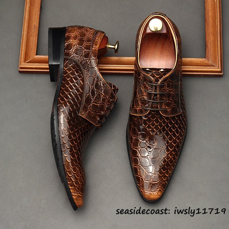 - 定価10万超★最高級 メンズ ビジネスシューズ 鰐柄 本革 レザーシューズ 牛革 イギリス風 職人手作り 紳士靴 革靴 結婚式 ブラウン 28.0cm