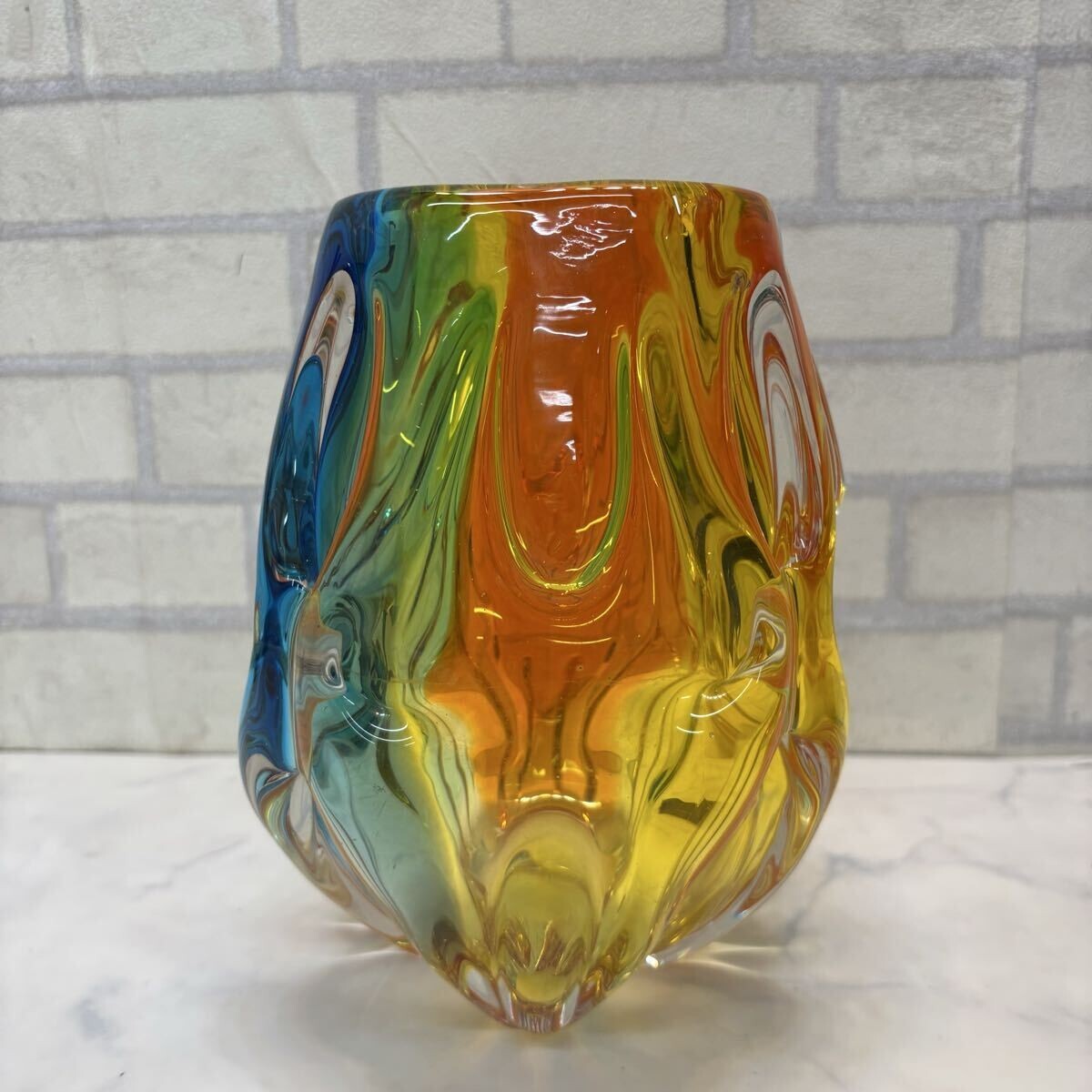 - 未使用 保管品 ガラス製 花瓶 フラワーベース 花入 花器 カラフル 重厚 ヴィンテージ アートガラス マーブル ガラス細工 レインボー