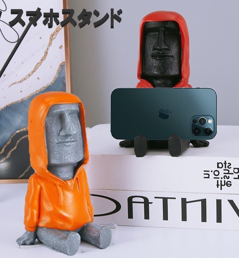 > モアイ像 スマホスタンド パーカーを着た モアイ モアイ/グレー パーカー/オレンジ オブジェ 装飾 おもしろ雑貨 n928