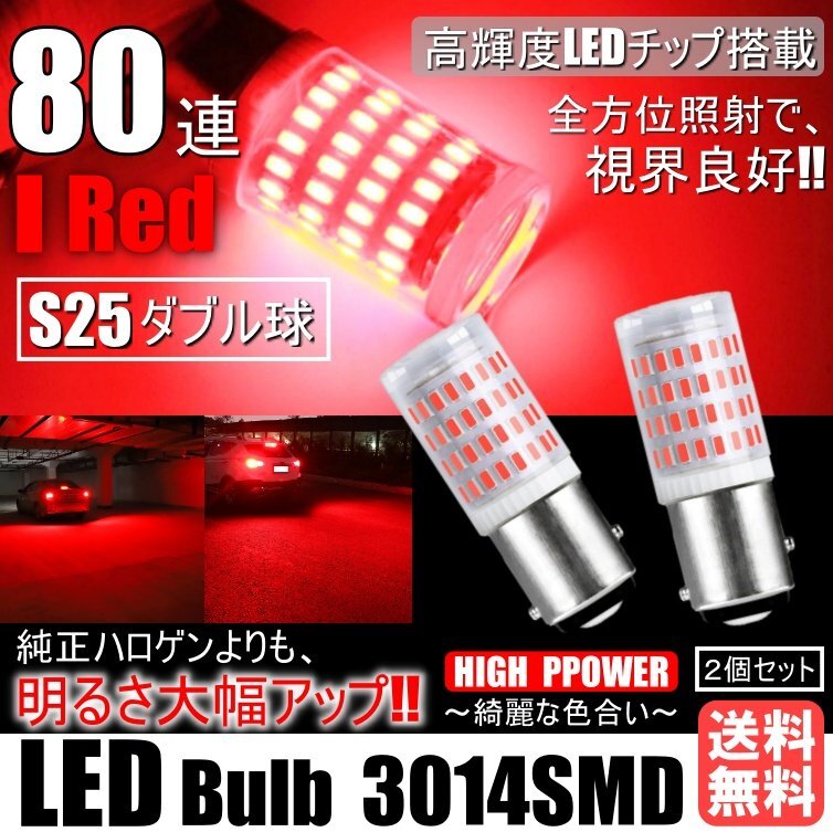 > 明るく綺麗に照らす!! 高輝度 80連 LED S25 ダブル ブレーキランプ ストップランプ テールランプ 赤 レッド 3014SMD 2個セット