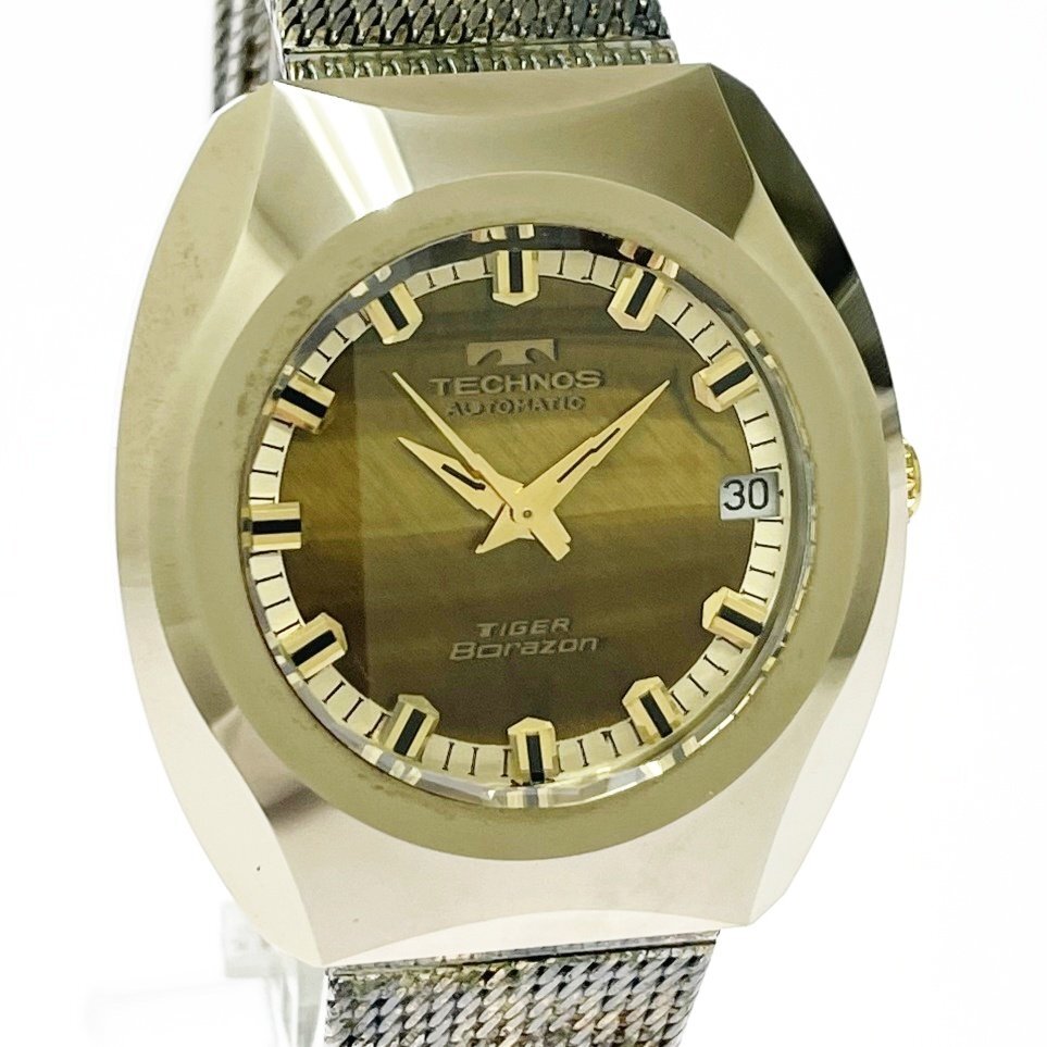 - 【1円スタート】【訳あり品】TECHNOS テクノス TIGER Borazon カットガラス GP×SS ブラウン系文字盤 自動巻き メンズ腕時計 510721