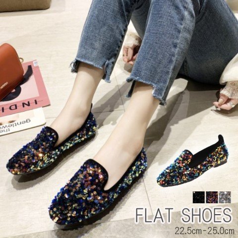 - レディース スリッポン フラットパンプス 靴 シューズ 黒 キラキラ スパンコール 可愛い 23.0cm(36) ブルー