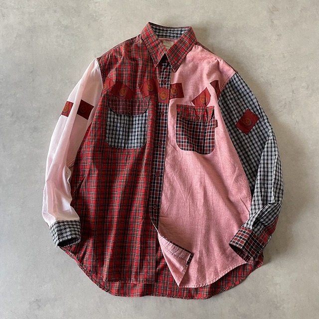 > 良品 カールヘルム Karl Helmut パッチワーク ロゴ 刺繍 チェック クレイジーパターン ボタンダウン 長袖 シャツ (M) ピンクハウス /e-073
