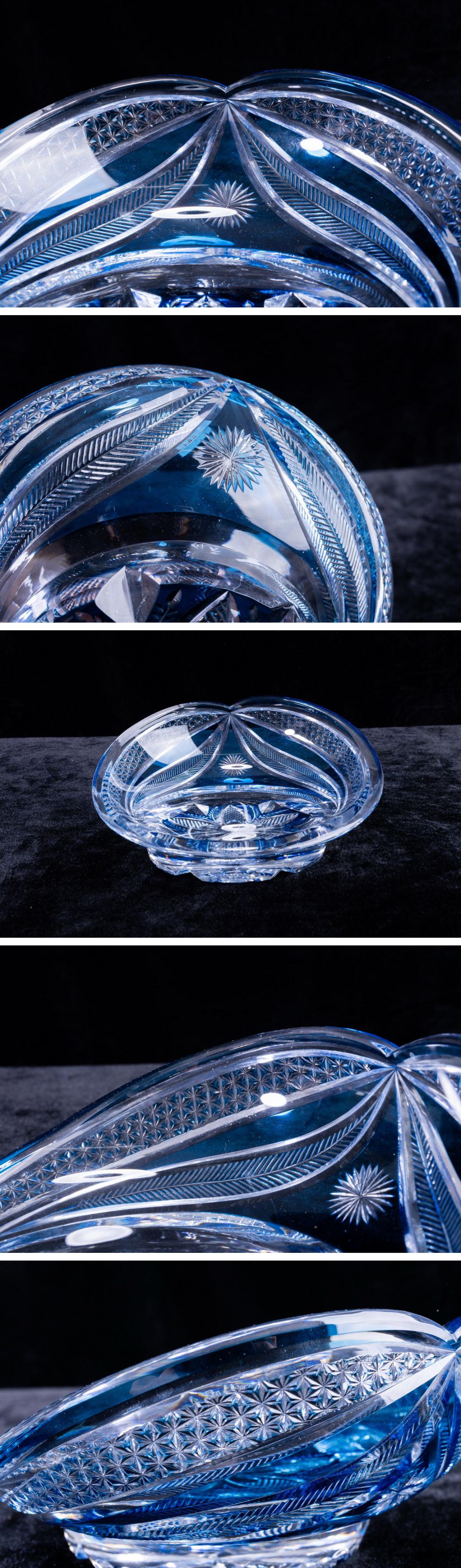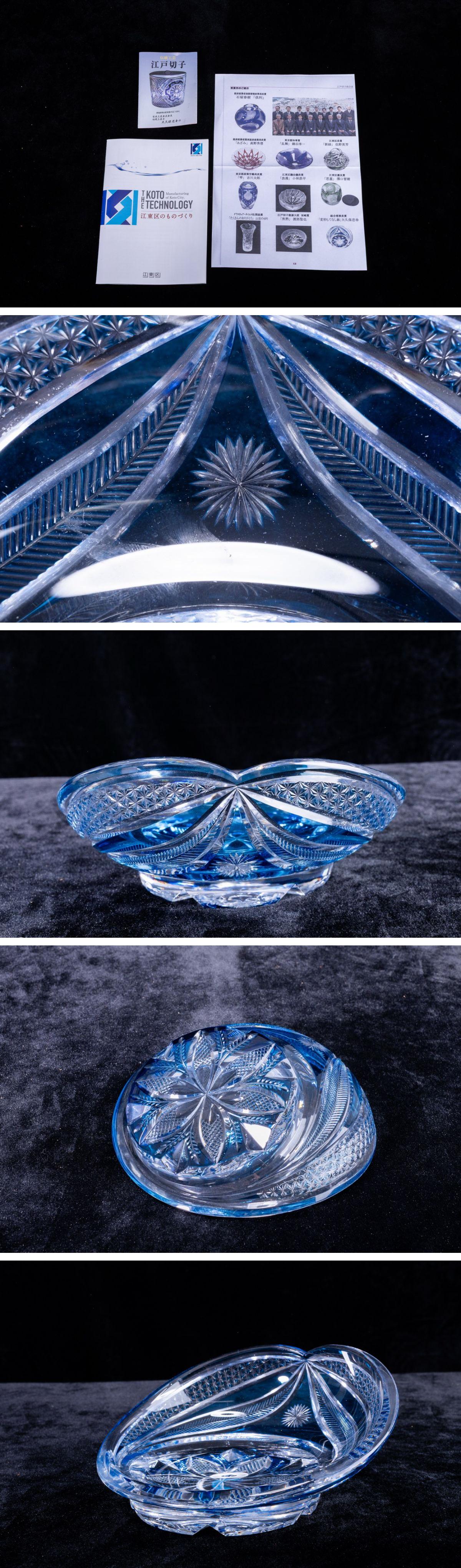 > 【珍品堂】1円から AK14 江戸切子 大久保忠幸 作 変形もてなし鉢 在銘 鉢 高9cm 菓子器 変形皿 瑠璃色 ガラス 硝子 工芸品 共箱 置物