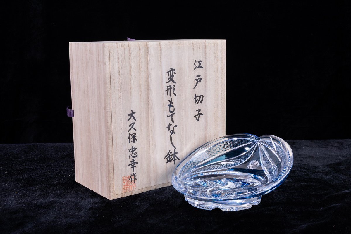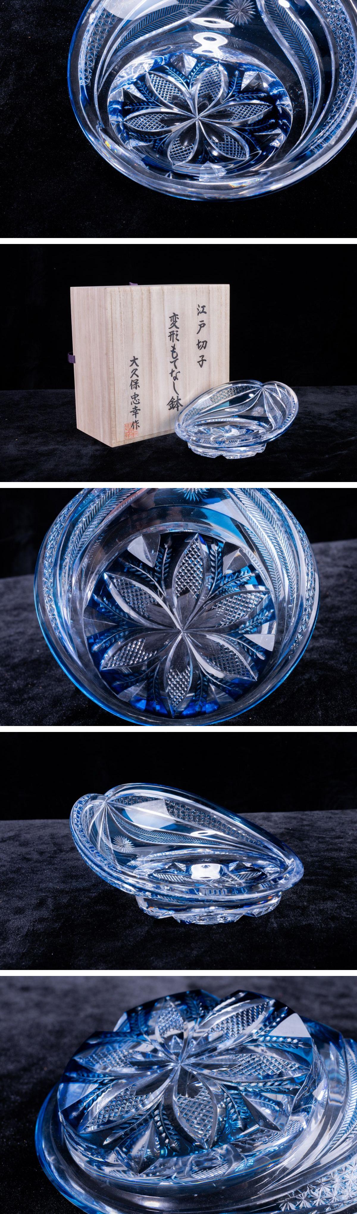 - 【珍品堂】1円から AK14 江戸切子 大久保忠幸 作 変形もてなし鉢 在銘 鉢 高9cm 菓子器 変形皿 瑠璃色 ガラス 硝子 工芸品 共箱 置物