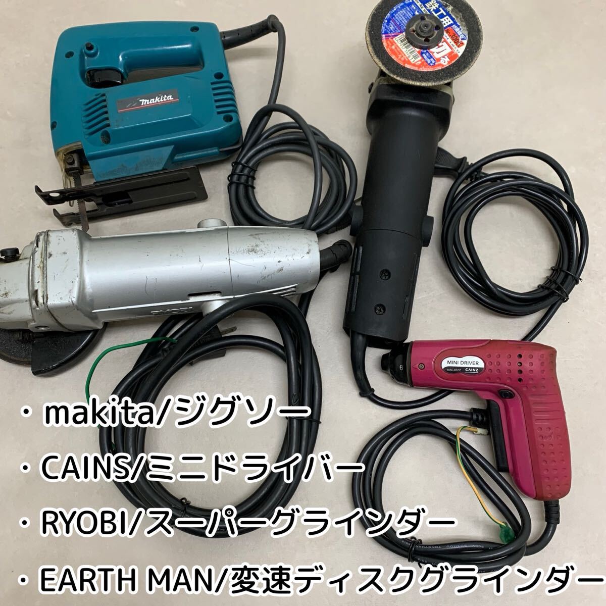 - H■ 電動工具 4点 まとめて マキタ ジグソー カインズ ミニドライバー RYOBI スーパーグラインダー アースマン 変速ディスクグラインダー