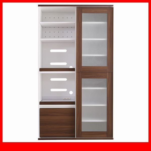 - 食器棚★ガラス引戸食器棚 家電収納庫/ワイド 幅100cm/スライド式ガラス扉 可動棚 2口 コンセント付き/ウォールナット/a3