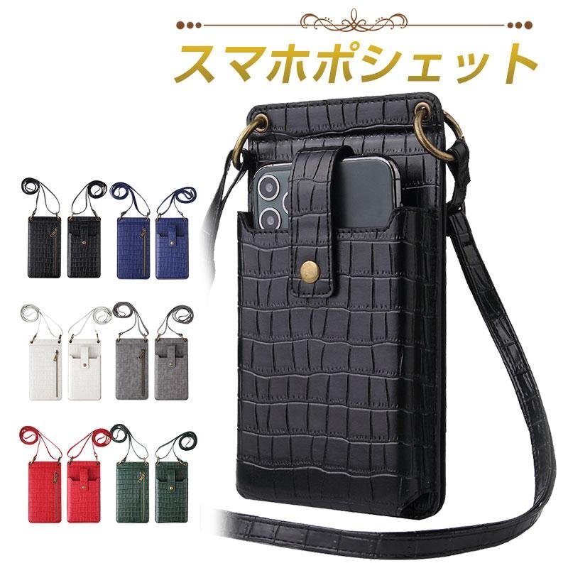 - セール スマホポシェット ショルダーバッグ スマホポーチ カードケース ミラー 鏡 ショルダー 縦型 クロコ型押し ブラック