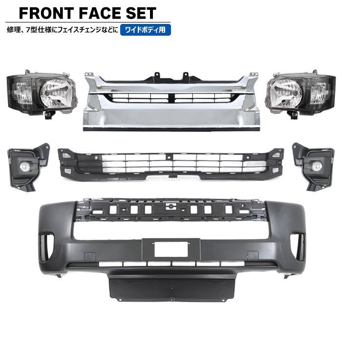 - 200系 ハイエース ワイド 7型 8型 フロント 7点 フェイス チェンジ セット Ver.3 ハロゲン ヘッドライト グリル バンパー LEDフォグ トヨタ