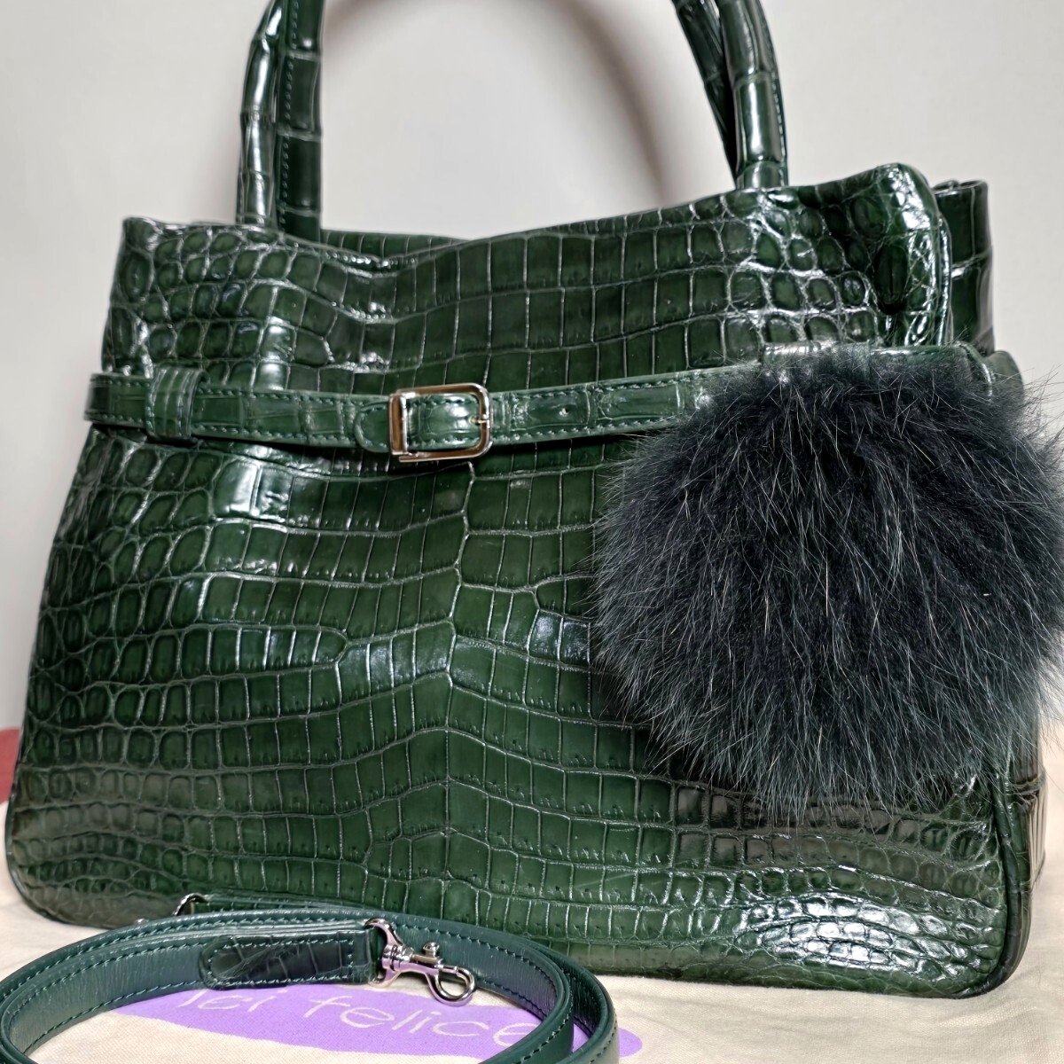 - 希少色 JRA lei felice クロコダイルレザー ワニ革 鰐 エキゾチック ハンドバッグ グリーン 緑 日本製 ファーチャーム 2way センター取り