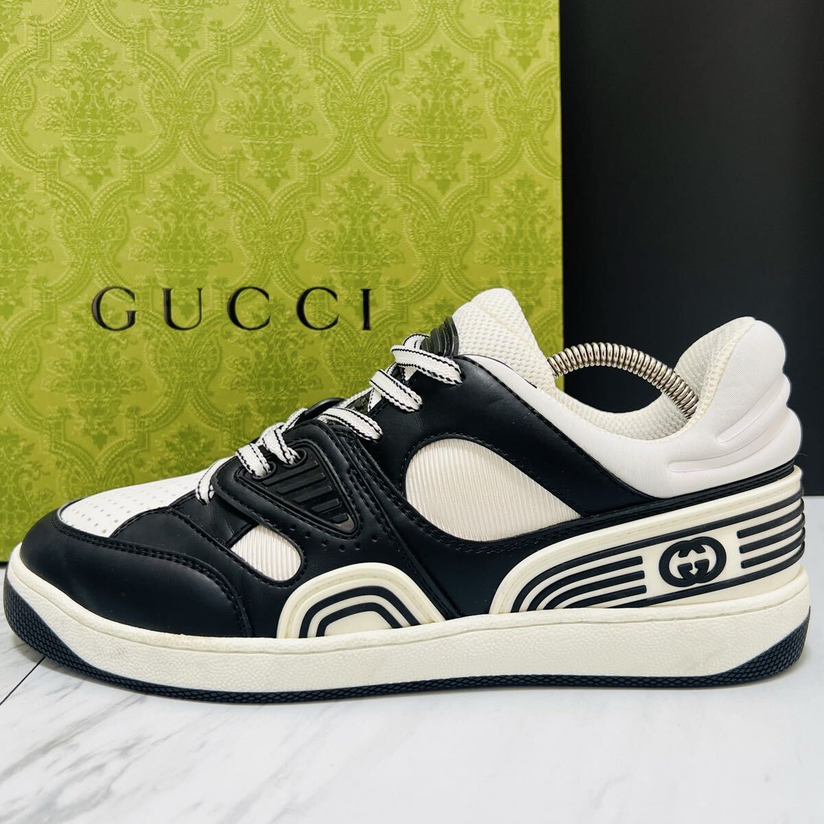 - 新品同様●GUCCI グッチ BASKET バスケット インターロッキング Bee レザー スニーカー シューズ 靴 6 メンズ レディース 25cm相当 白黒