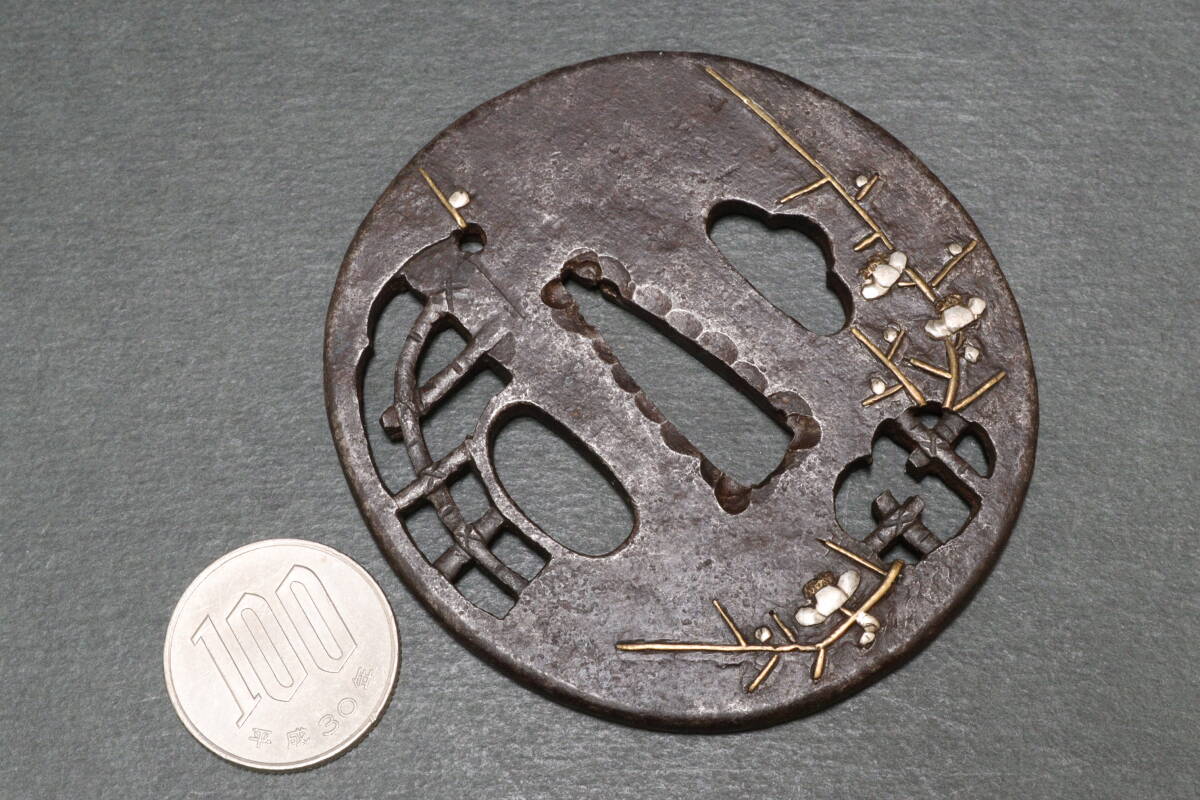 - D 時代物 骨董 江戸期 武具 刀装具 梅図象嵌 格子透かし 丸形 鉄地 鍔 鐔 重量90g