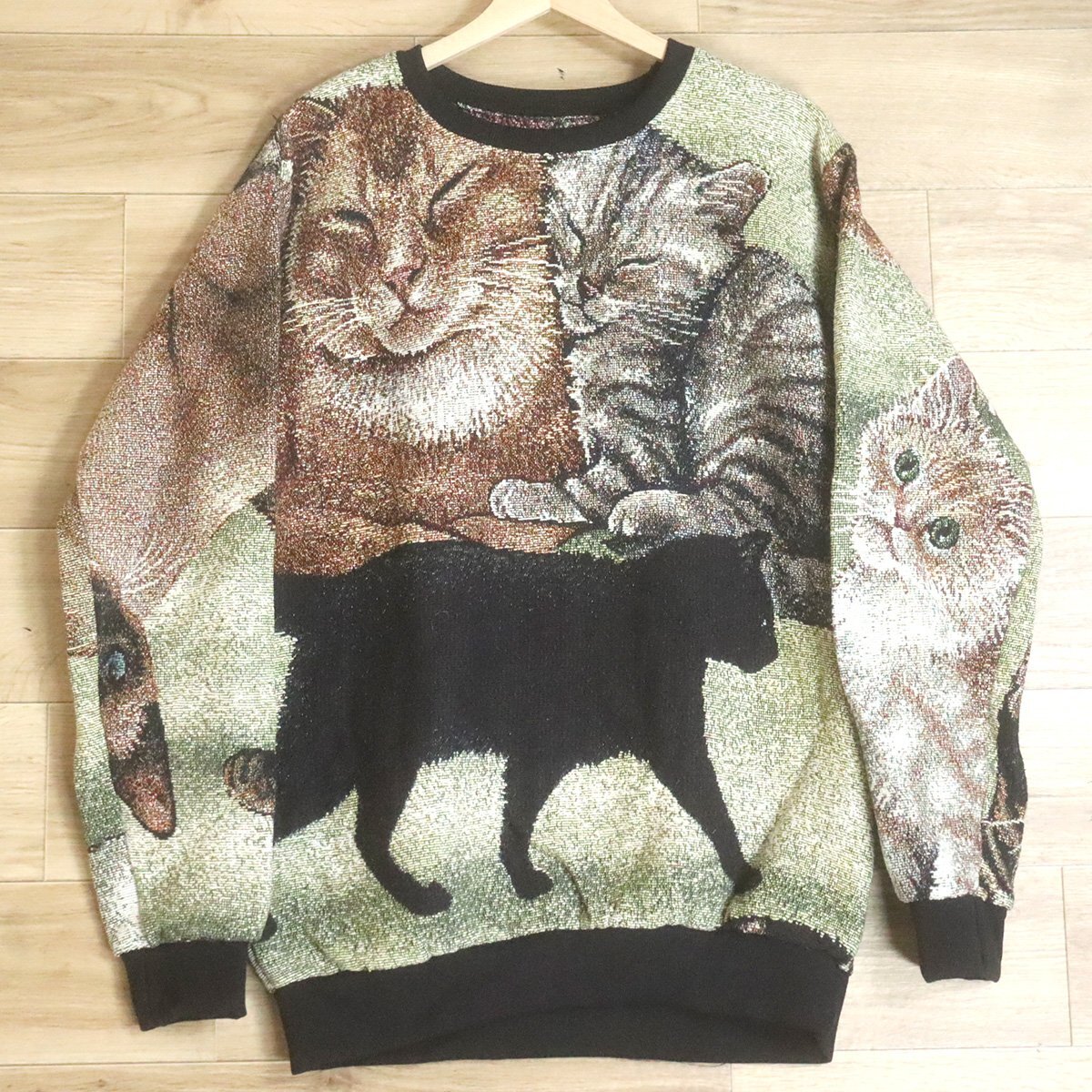 - #1T/D11.24-2 アメリカ古着 ビンテージ ゴブラン ラグ リメイク スウェット トレーナー ネコ 猫ちゃん 総柄 クレイジー