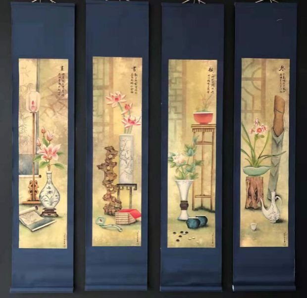 - 店長勧め 極美品 ! 中国美術 掛軸 4点セット 静物画 花絵柄 鑑賞 巻物 中堂画 装飾 立軸 zh662