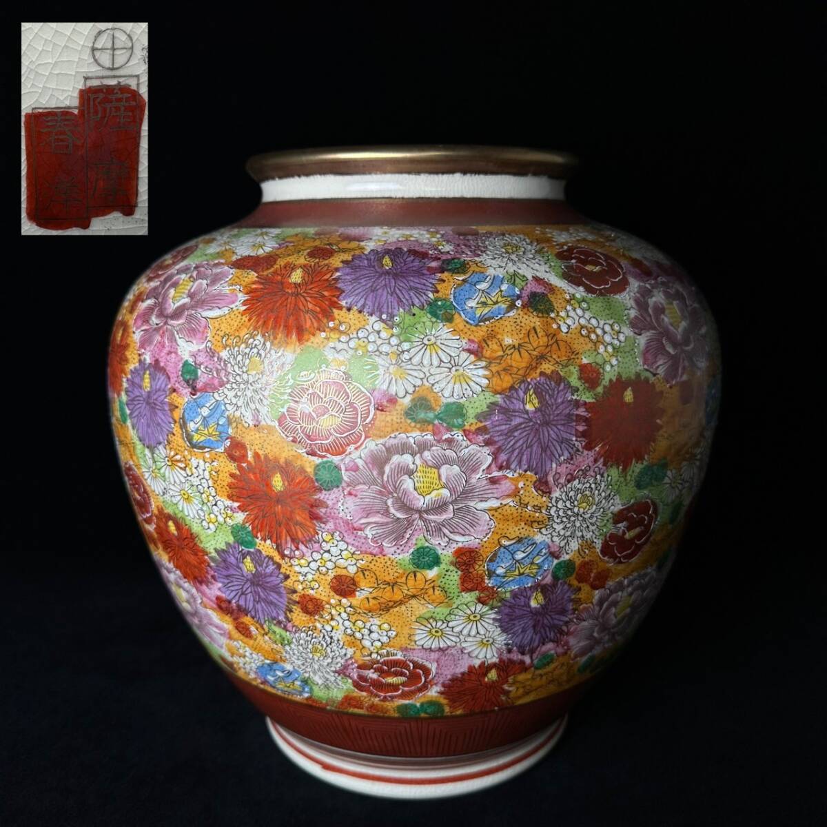 - コレクター買取品 薩摩焼 春洋 造 百花繚乱 花詰文花瓶 在銘 落款 飾壺 花入 花器 色絵金彩 飾物 置物 時代物