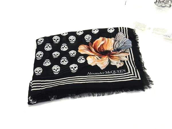 > 1円 ■極美品■ ALEXANDER McQUEEN アレキサンダー マックイーン レーヨン 総柄 大判 スカーフ ストール ショール ブラック系 FJ7611