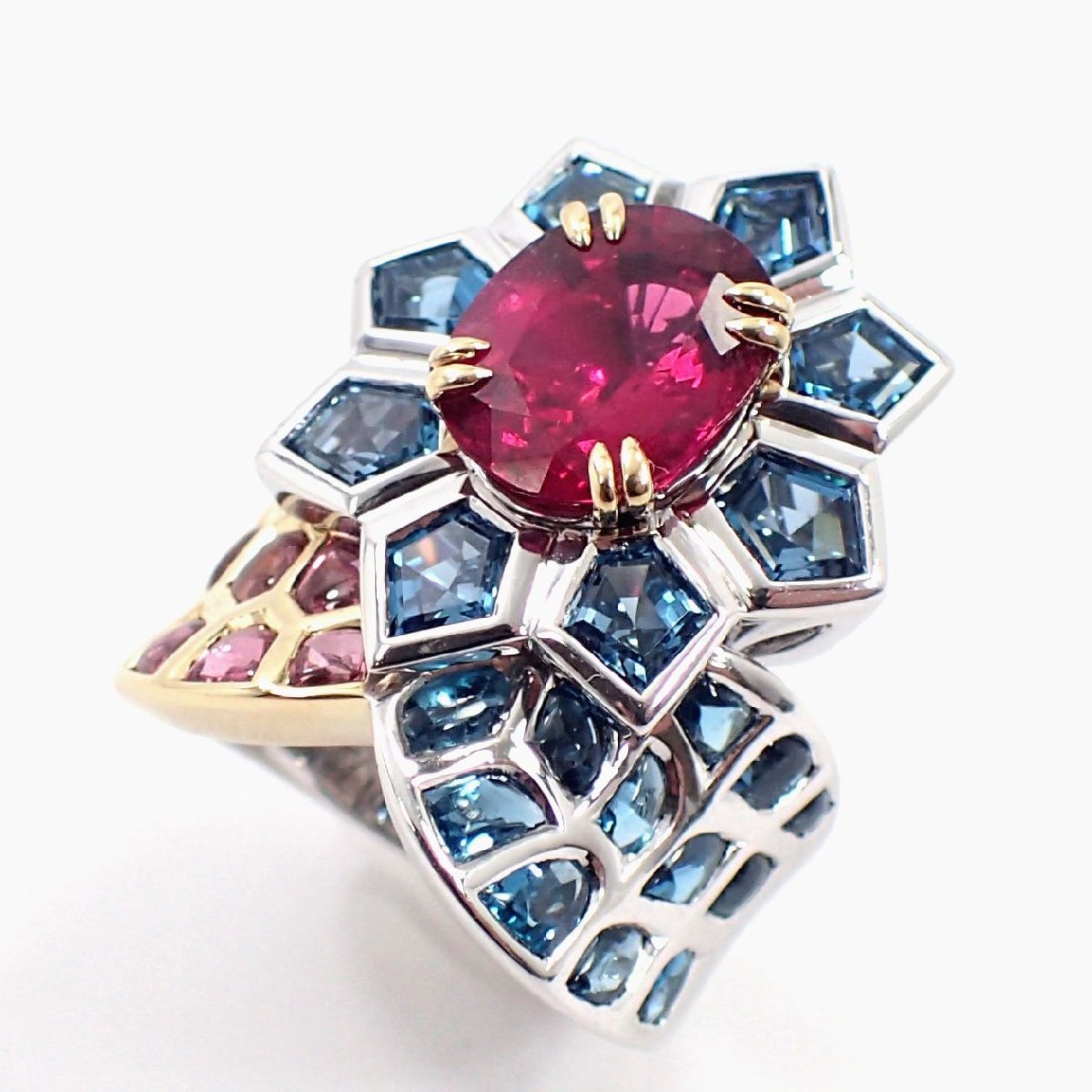 - 【吉村質店】【ジュエルスタジオ】K18レッドトルマリン4.06ctピンクトルマリン1.47ctブルートパーズ3.11ct/1.66ctリング24.9g#14鑑別書