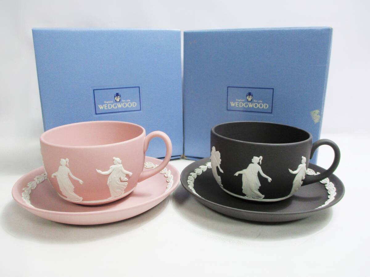 > 《ジャムルK》 hc1205-21◆◆ WEDGWOOD ウエッジウッド ジャスパー ダンシングアワー ブラック ピンク カップ& ソーサー 2客セット 箱付
