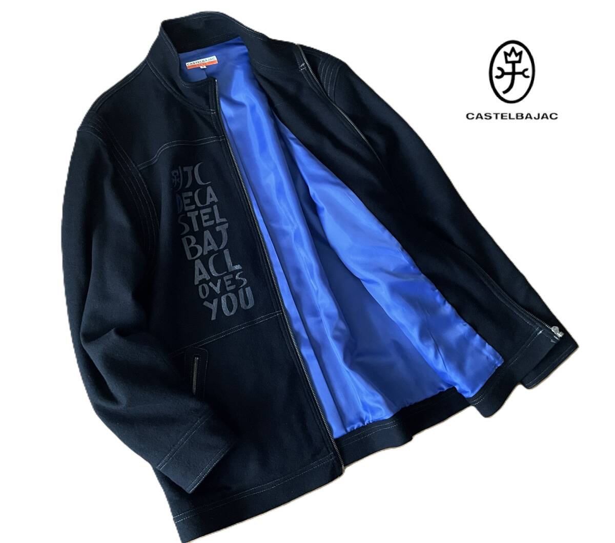 > 美品 CASTELBAJAC SPORT カステルバジャック ジップ ウールジャケット ロゴプリント 家紋ロゴ メンズ 5 ブラック 黒 ライカ
