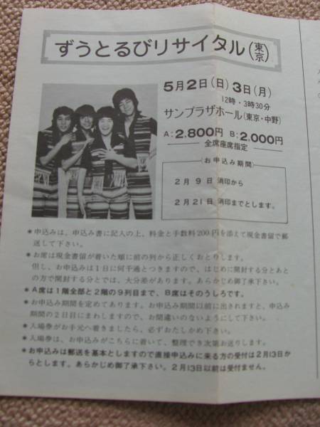 - ★ずうとるび リサイタル 東京/中野サンプラザ 昭和51年/1976年5月 チケット申込書 山田隆夫 江藤博利 新井康弘 今村良樹 笑点