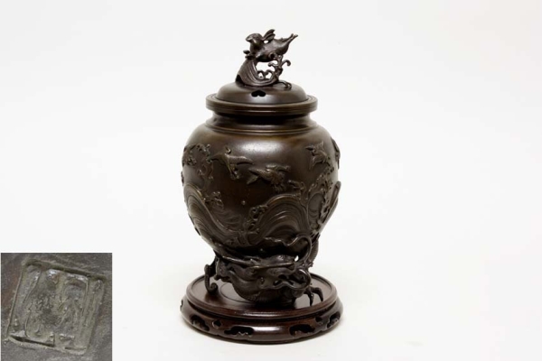 - harip 紫檀透彫丸台付 青銅 波兎摘 龍足香炉