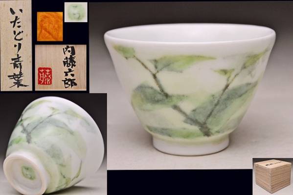 - 内藤六郎 ★ いたどり青葉ぐい呑 ★ 共箱共布 ★ 釉下彩タイプ ★ 酒器 盃