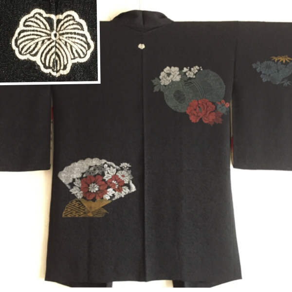 - 【黒絵羽織】正絹 袷 羽織丈78.5cm 扇 鼓 牡丹 ラメ 貝の羽織紐