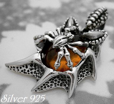 - シルバー925銀の天然石アンバー琥珀入りスパイダー蜘蛛ペンダント/Bu-boon silver