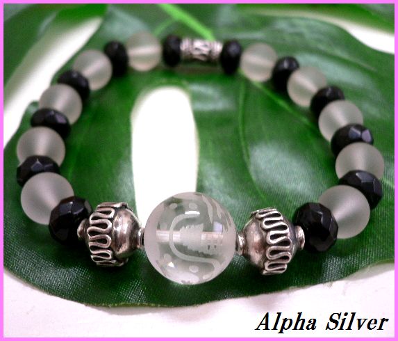 - シルバー925銀パーツ付 天然石8mmフロスト水晶 オニキス 龍紋 水晶ブレス/ラスト1点