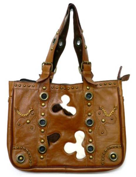 - 牛革×本ハラコmix パンク風スタッズ トートバッグ茶 1点のみ/レザーバッグALL20%OFF