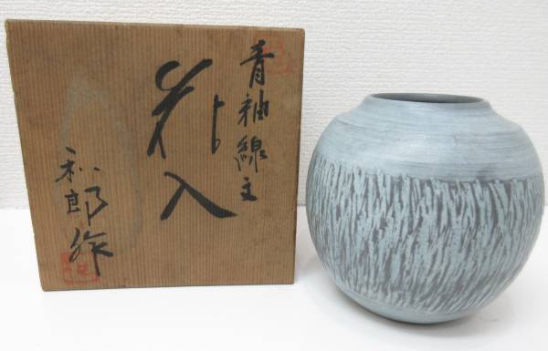- 並品■京焼 岡本和郎 青釉線文 花入 花器 花生 木箱 管理1705 E-10