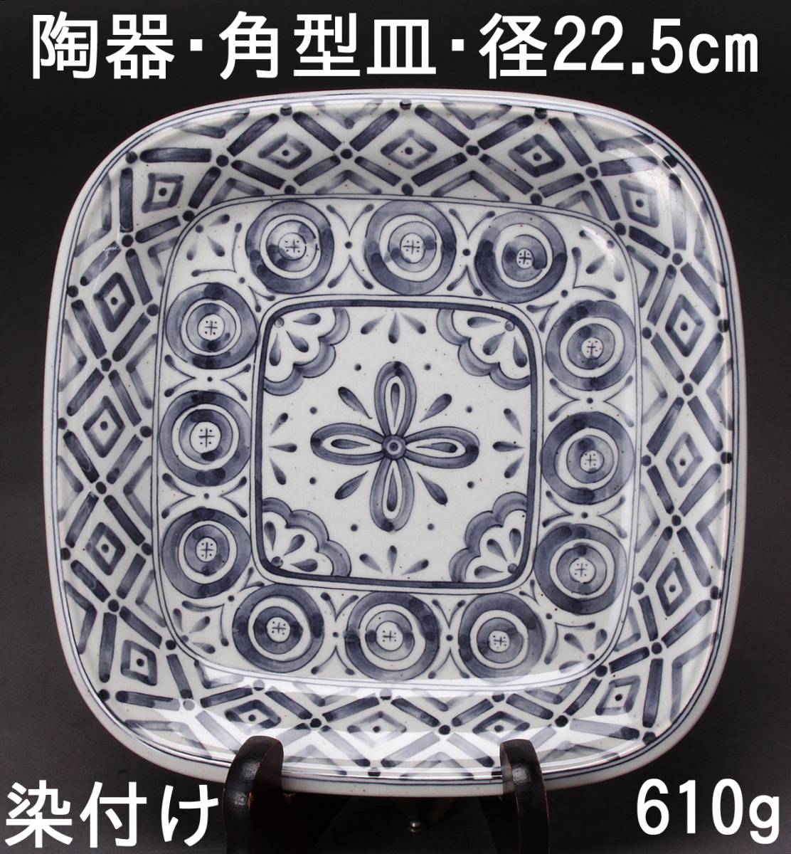 - 陶器 角皿 染付 茜造 縦横22.5㎝ 610g 中古 KA-6618