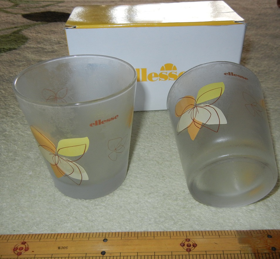 - 昭和レトロ レトロ エレッセ ガラスのコップ タンブラーグラス ellesse 可愛い花柄 未使用 高さ 約8.5cm 口径 約7.8cm