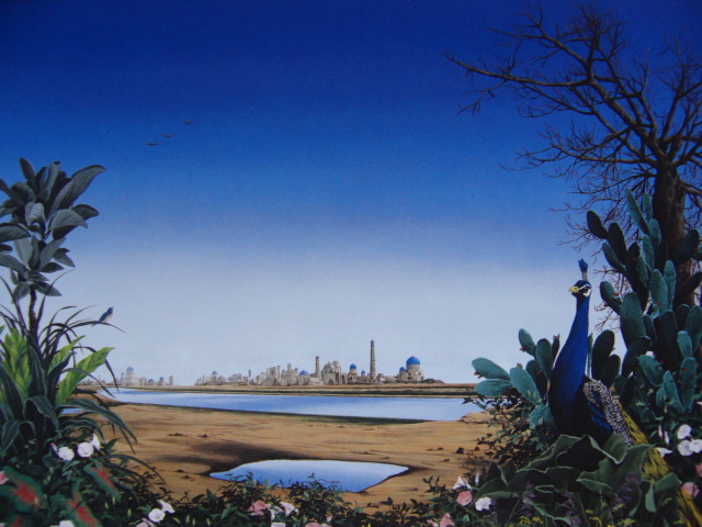 - 北久美子、【遠き旅空 青い空】、希少な画集画、新品高級額 額装付、状態良好、送料無料、絵画 風景画