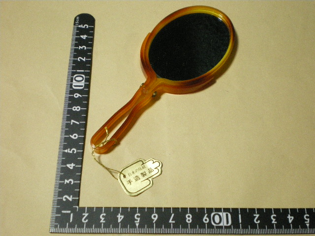 - 珍品フリマ] 手鏡 化粧鏡 べっ甲風 小ぶり 鏡面は直立も可能 「手造り製品」 全長14cm 鏡寸法7cm×5cm 元箱(経年変化あり)つき[送料無料]