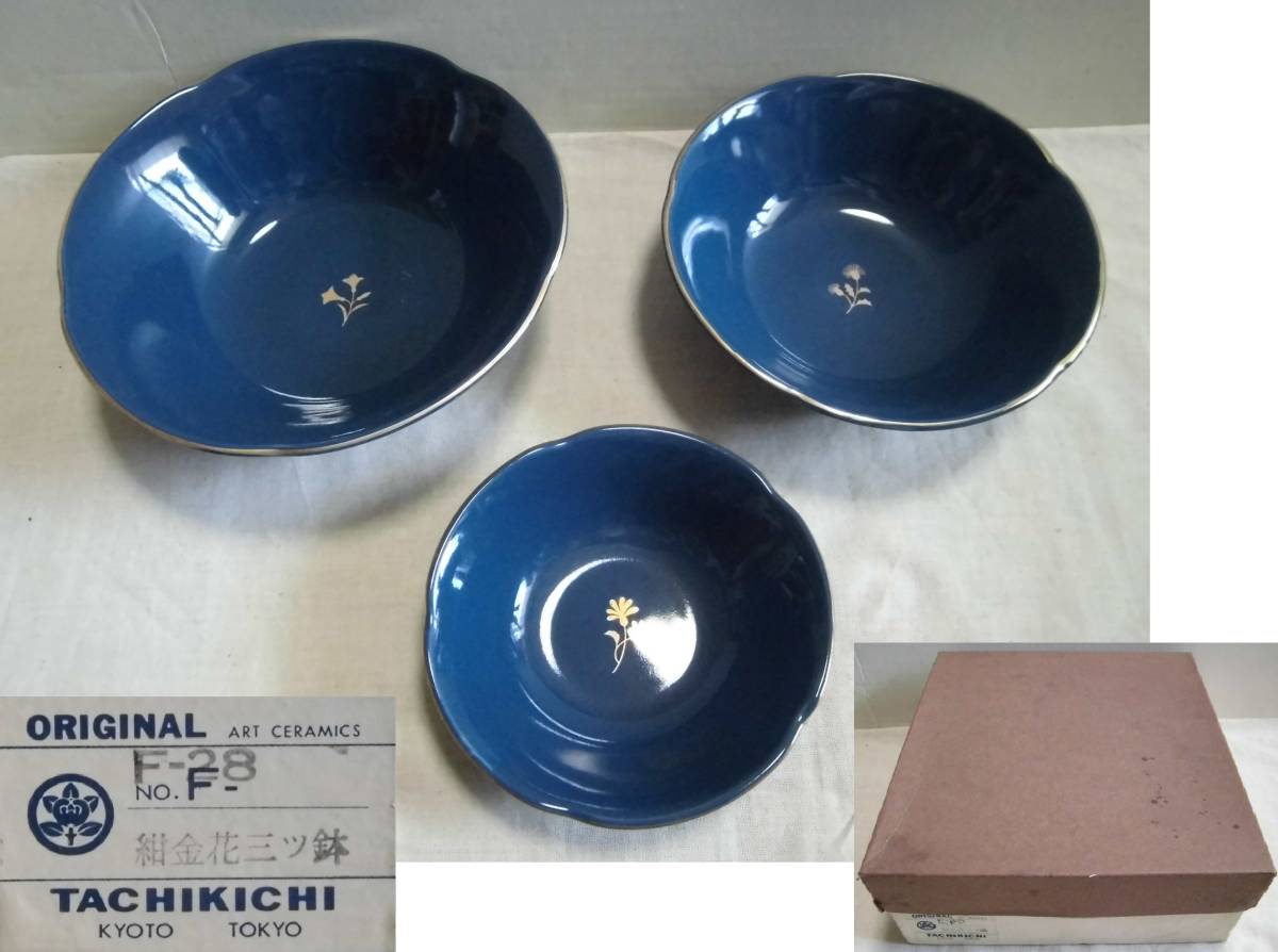 > ★たち吉 TACHIKICHI ORIGINAL 紺金花 絵変り 三つ鉢 三ツ鉢 径約19cm 16.5cm 13cm 三つ揃え 橘吉 藍色 中鉢 金彩陶器 工芸品 レトロ★
