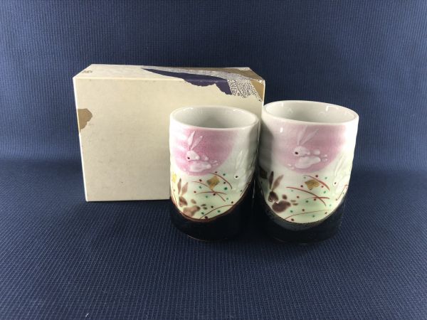 - 未使用品★ 九谷焼 九谷錦泉 はねうさぎ 組湯呑 2客 共箱あり管理1806 M-1