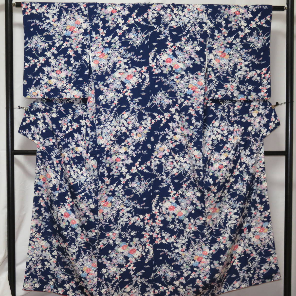 - 【桐輪 】小紋☆四季草花☆送料無料*着用感なし*美品{正絹*袷*小紋}*身丈153-裄63.5*一越縮緬地*紺青色地*四季草花と吉祥文様*№2451315