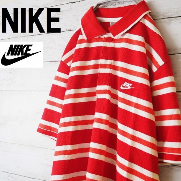 > 大人気◆NIKE ナイキ ポロシャツ 刺繍ワンポイントロゴ サイズM 赤x白 ボーダー/340