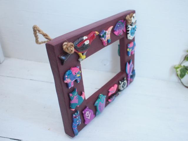 - ビンテージバリ島面白木彫り*猫・動物がいっぱい壁掛けフレーム*エンジ・G☆インテリアディスプレイ飾り